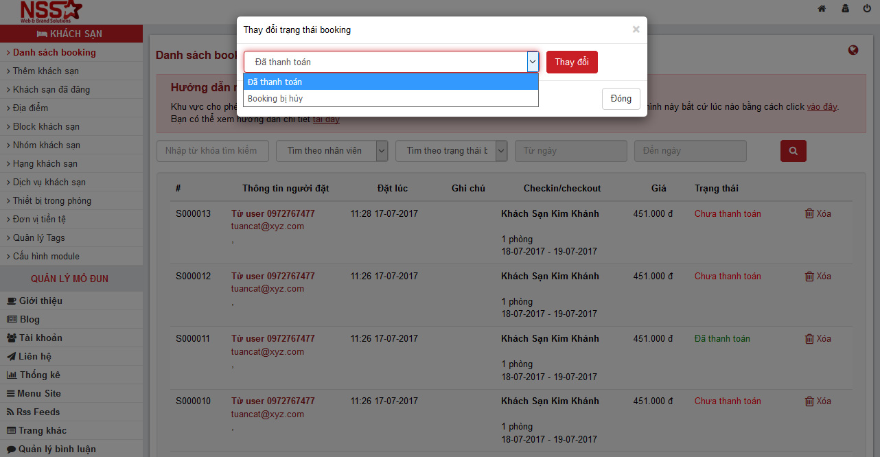 Tương tác 2: Thay đổi trạng thái đặt phòng, xin lưu ý: khi thay đổi hệ thống sẽ gởi trạng thái đến các số điện thoại liên quan bao gồm: số điện thoại của chủ khách sạn (nếu khách sạn đã đăng có số điện thoại di động), số điện thoại admin chính.