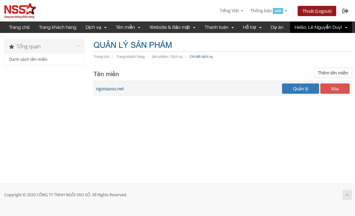 Sau đó bạn sẽ thấy tên miền xuất hiện trong danh sách cần quản lý, bạn đã có thể bấm vào quản lý hoặc xóa tên miền vừa tạo.