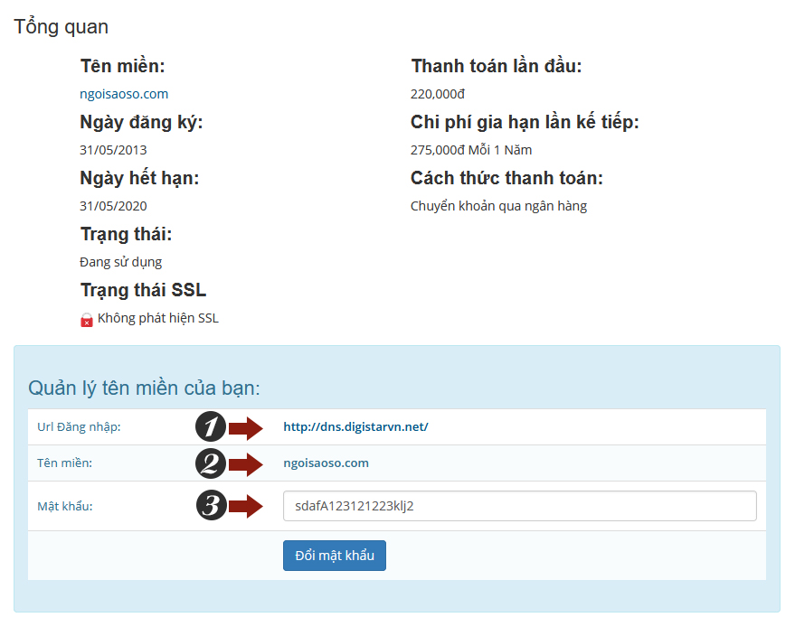 Sau đó kéu con chuột xuống dưới như hình, tại khu vực Quản lý tên miền của bạn, sẽ có 3 ô bao gồm: Url Đăng nhập, Tên miền và Mật khẩu. Bạn bấm vào URL đăng nhập, trình duyệt sẽ mở ra một tab mới, tại đây bạn nhập tên miền và mật khẩu của mình để đăng nhập vào hệ thống DNS