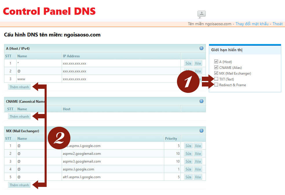 Tại đây, khu vực 1 cho phép bạn lựa chọn sẽ cấu hình kiểu bản ghi DNS nào, khu vực 2 chứa các nút bấm cho phép bạn thêm nhanh các bản ghi DNS cho tên miền của bạn.