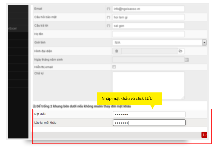 Kéo xuống bên dưới cùng màn hình có ô thay đổi mật khẩu. Nhập mật khẩu mới và nhấp Lưu để thực hiện việc thay đổi mật khẩu.